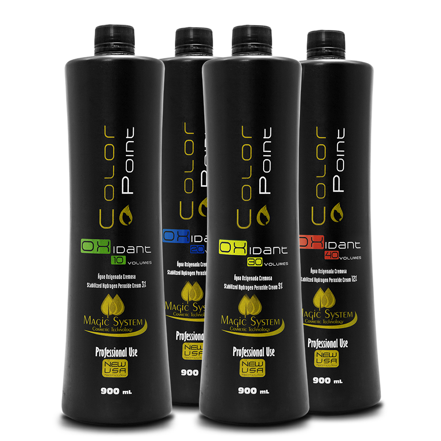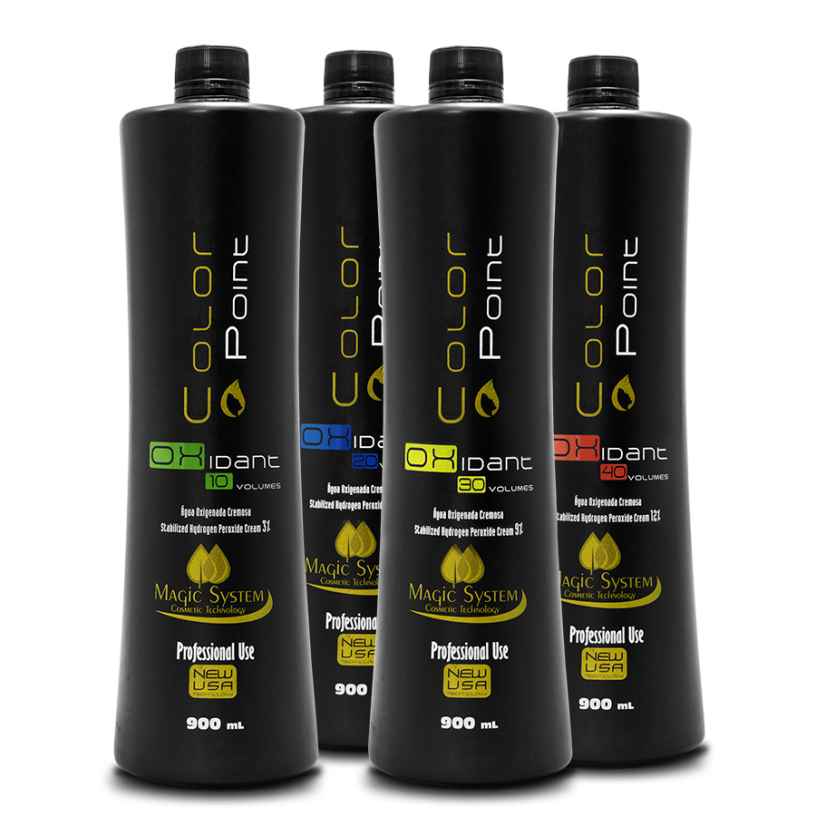 Disponível em 4 volumagens contendo as seguintes concentrações de peróxido de hidrogênio: 10V (3%), 20V (6%), 30 V (9%) e 40 V (12%).